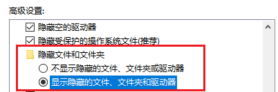2.在弹出的窗口中,切换到“查看”,在“高级设置”区域里,找到“显示隐藏的文件、文件夹和驱动器”,把它勾选上,最后点“确定”,保存设置就可以啦。